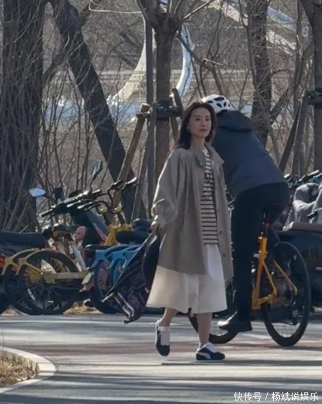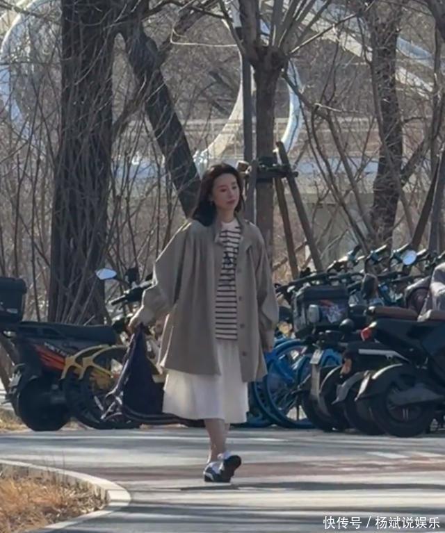 随后,董洁换上一件宽松的浅卡其色中长款风衣,内搭黑白条纹针织衫与白色中长裙,脚踩一双黑白拼色休闲鞋,整体色调柔和统一,既舒适又不失时尚感。行走在户外小路上的董洁,姿态优雅,步伐轻盈,展现出良好的体态与气质,而背景中的树木与停放的电动车为画面增添了生活气息,阳光洒在她身上,更显温婉动人。