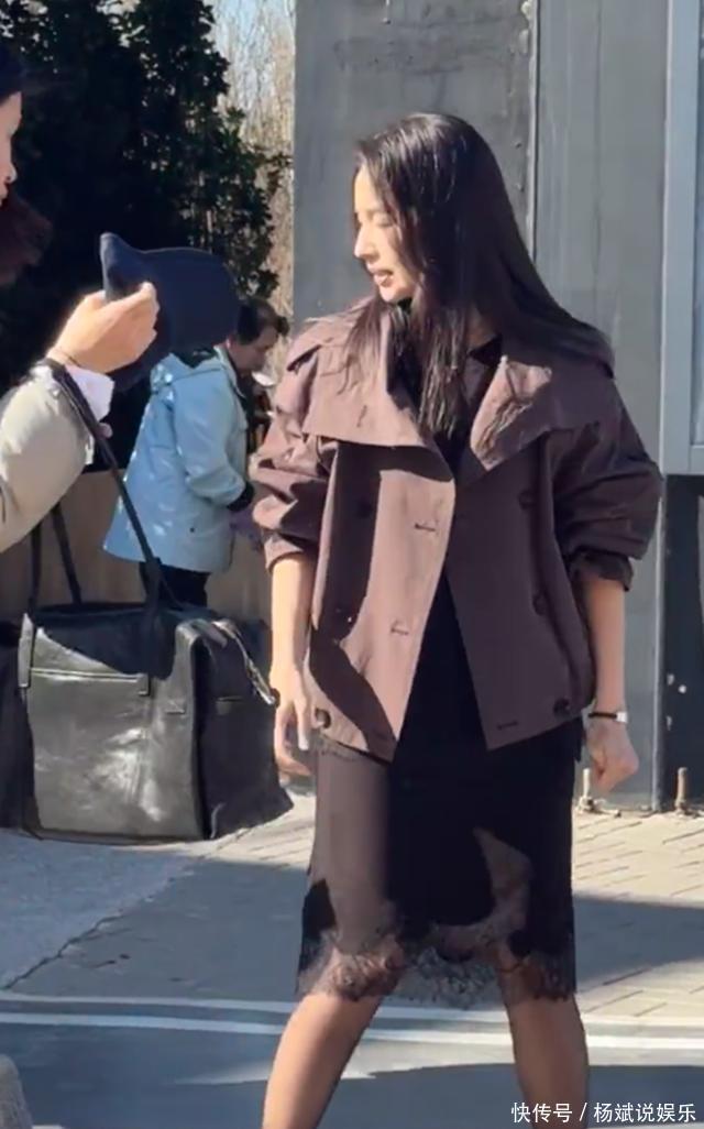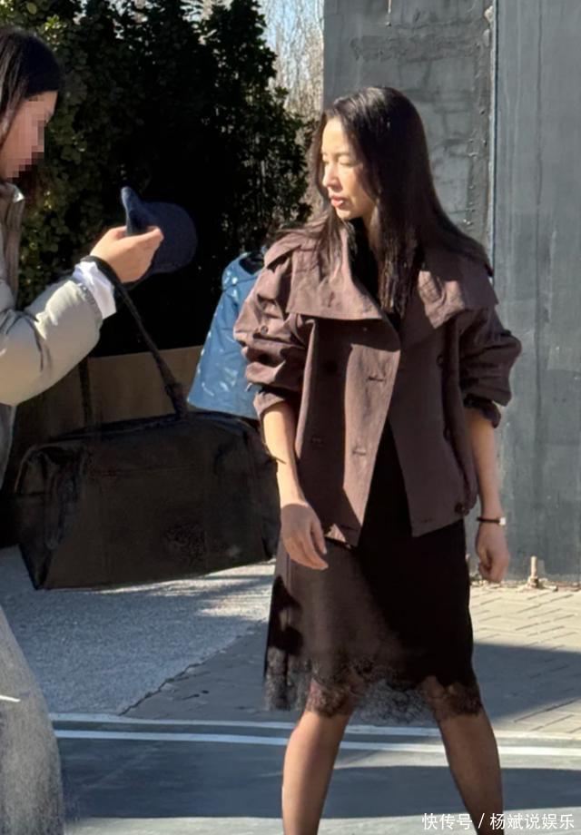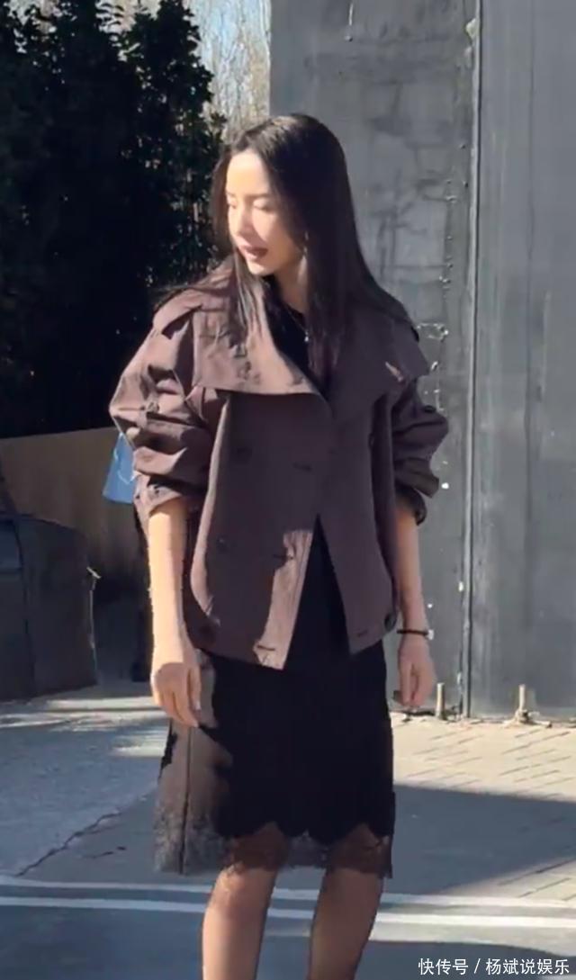 晒出的照片中,董洁换了两套造型,先来看看董洁的第一套造型,她身着一件深棕色短款风衣,内搭黑色连衣裙,裙摆带有蕾丝花边设计,整体造型简约中透着精致,展现出她一贯的优雅与知性。路人镜头下的董洁个头不高,属于娇小型,不过,身材比例很好,行走时的董洁姿态从容,腿部线条修长,尽显女性柔美。她的皮肤状态极佳,白皙细腻,阳光下更显通透,面部轮廓清晰,妆容淡雅自然,突显出她清冷温婉的气质。长发自然垂落,发丝柔顺,与整体穿搭相得益彰,营造出一种低调而高级的时尚感。